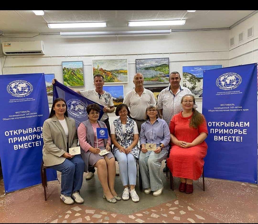 Приглашённые зрители, школьники и взрослые вышли к столу. Данное действо вызвало особенное волнение у всех присутствующих. Евгений Николаевич установил печать на уголок марки на одной из открыток «140 лет Обществу изучения Амурского края» на столе. Все, кто стоял у стола одновременно, нажатием рук погасили открытку одноимённой печатью. Церемония происходила под объективами многочисленных камер. После чего Евгений Николаевич Охрименко предложил самостоятельно погасить и подписать себе открытки на память, присутствующим в зале вручили памятные значки и флажки Русского географического общества.